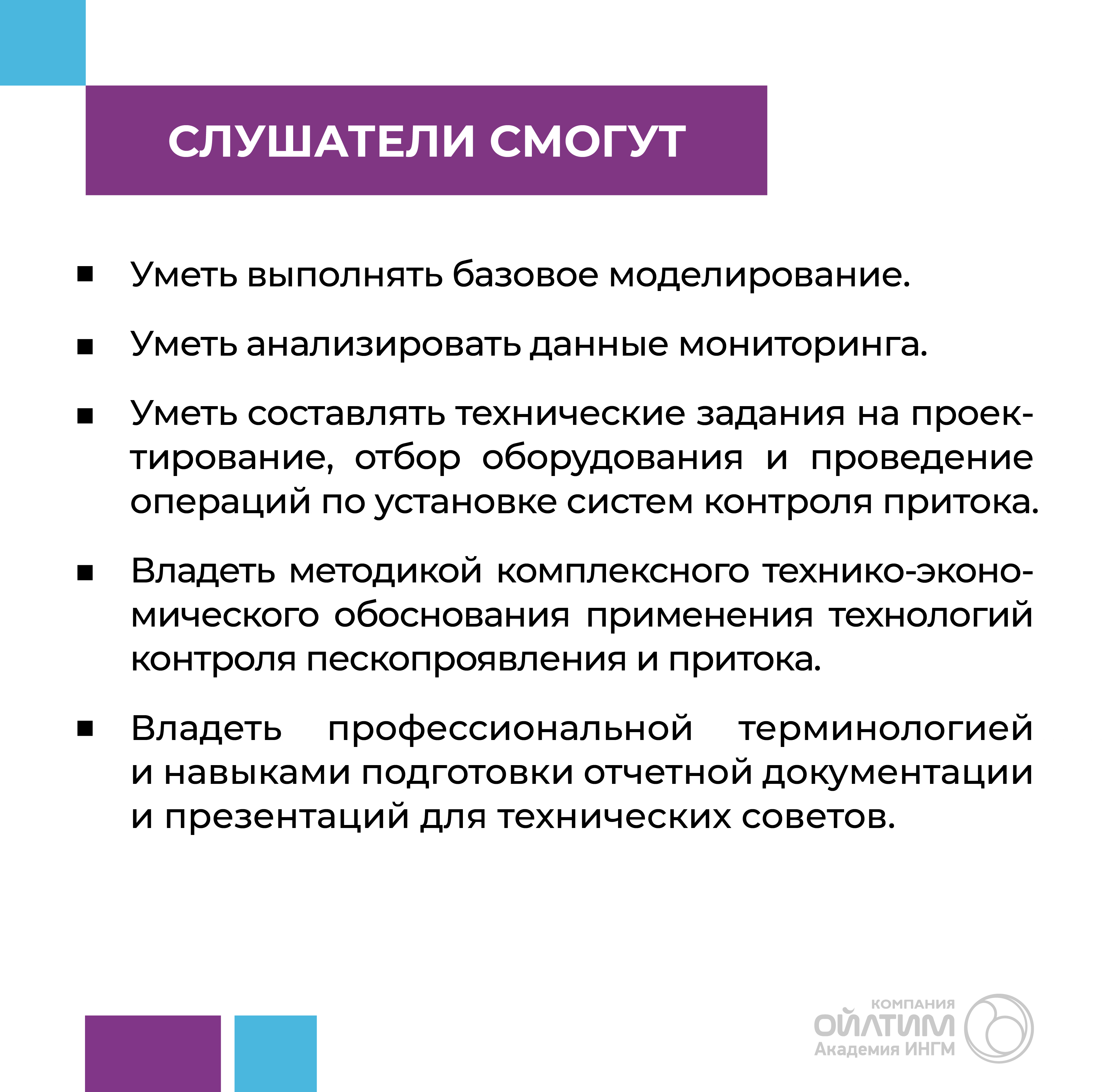 Цель курса: подготовка высококвалифицированных специалистов, способных комплексно решать проблемы пескопроявления и нежелательного притока воды и газа в горизонтальных скважинах на всех этапах — от проектирования до анализа эффективности принятых мер, используя современные методы диагностики, моделирования и технологии управления притоком.